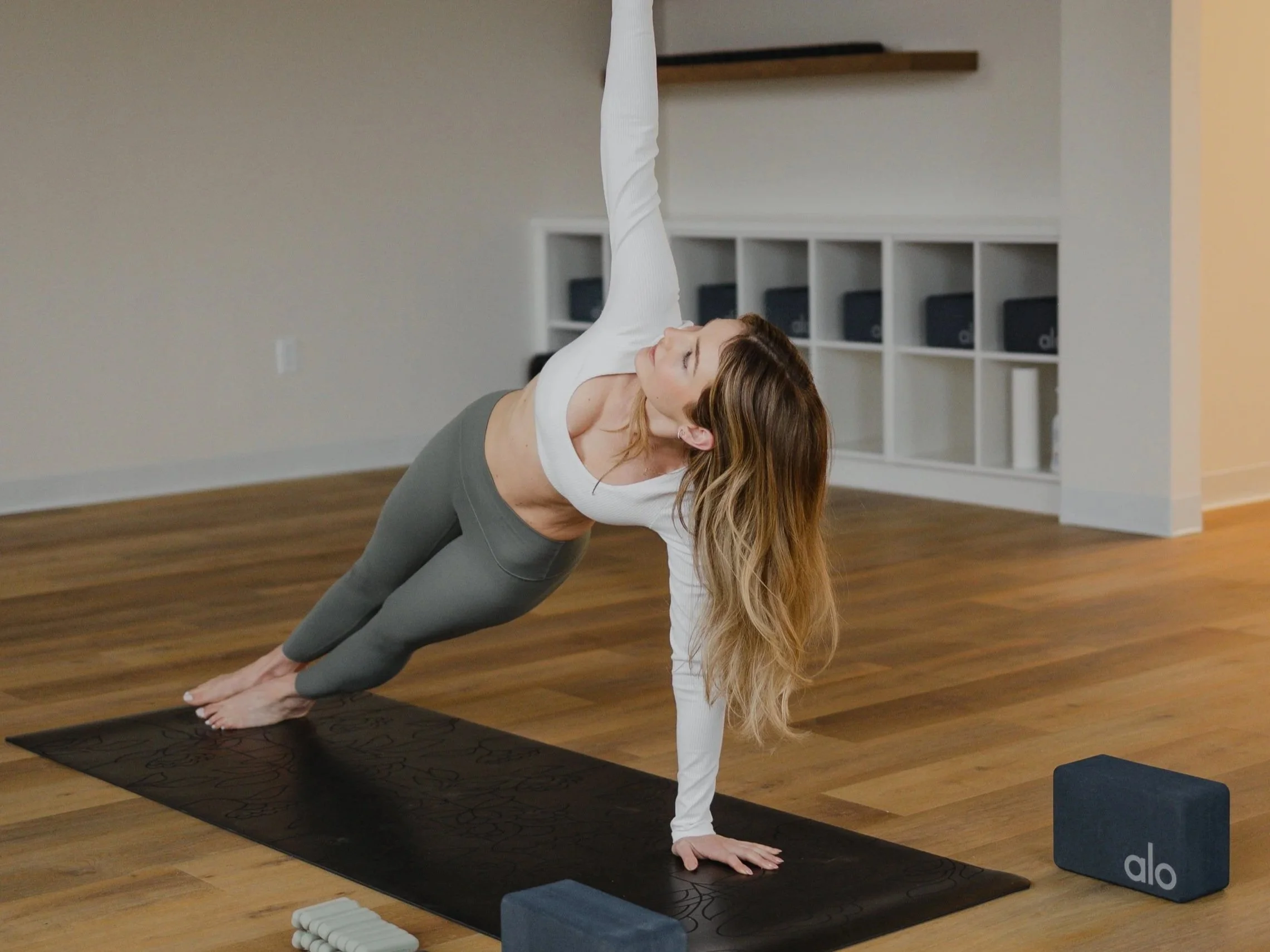 Power yoga meets sculpt. A dynamic flow layered with strength intervals, challenging holds, and props like weights and bands for a full body burn.